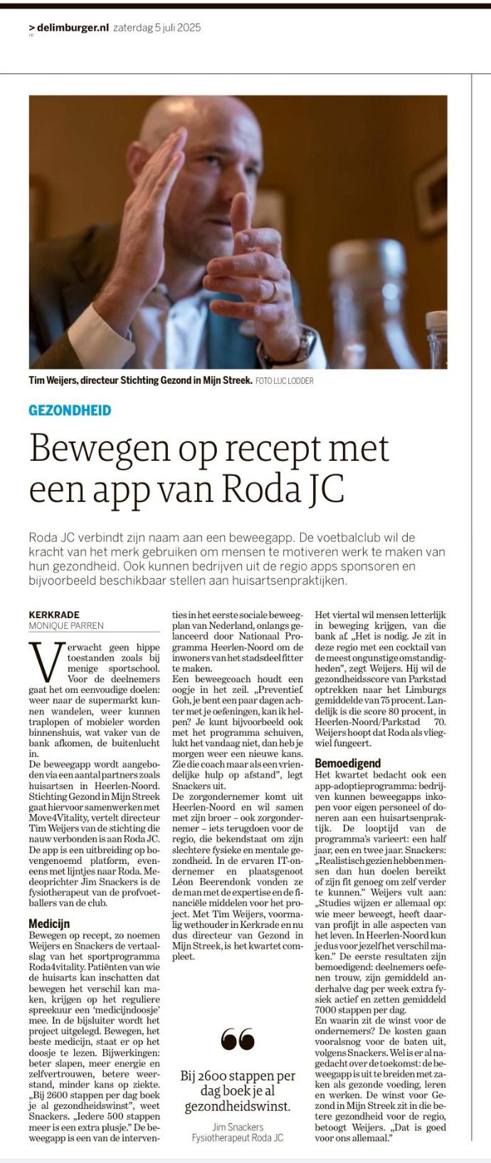 De beweegapp wordt aangeboden via een aantal partners zoals huisartsen in Heerlen-Noord. Stichting Gezond in Mijn Streek gaat hiervoor samenwerken met Move4Vitality, vertelt directeur Tim Weijers van de stichting die nauw verbonden is aan Roda JC. De app is een uitbreiding op bovengenoemd platform, eveneens met lijntjes naar Roda. Medeoprichter Jim Snackers is de fysiotherapeut van de profvoetballers van de club.