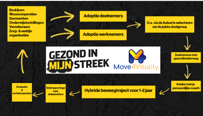 De app is een uitbreiding op het bestaande Move4Vitality-platform en richt zich op het bevorderen van een duurzame, actieve leefstijl bij deelnemers die hierbij extra begeleiding nodig hebben. Bedrijven kunnen via het platform een groep deelnemers ‘adopteren’ en zo niet alleen maatschappelijk impact maken, maar ook bijdragen aan een vitalere en gezondere regio.